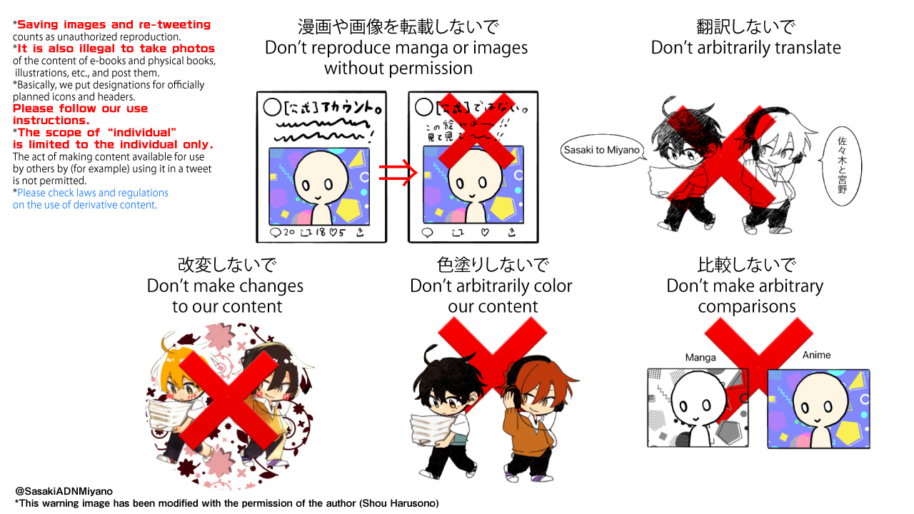 The reason we are making this announcement is so that everyone can continue to receive "Sasaki and Miyano" series, and be able to enjoy this work with peace of mind by following the rules.